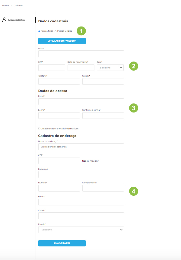 Clique em “Minha conta” e em seguida em ‘’Meu cadastro’’